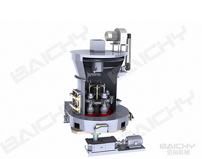 主機通過減速機帶動中心軸轉(zhuǎn)動,軸的上端聯(lián)結(jié)著梅花架,架上裝有磨輥裝置并形成擺動支點。磨輥裝置不僅圍繞中心軸回轉(zhuǎn),還圍繞磨環(huán)公轉(zhuǎn),磨輥本身因摩擦作用而自轉(zhuǎn)。梅花架下裝有鏟刀系統(tǒng),其位置處于磨輥下端,鏟刀與磨輥同轉(zhuǎn)過程中把物料拋起喂入磨輥磨環(huán)之間,形成墊料層,該料層受磨輥旋轉(zhuǎn)產(chǎn)生向外的離心力(即擠壓力)將物料碾碎,由此而達到制粉目的。
