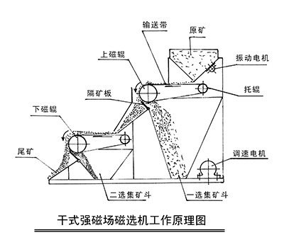 原料經過初步篩分后由皮帶機送進給料斗,之后落入磁鼓上方,且只能以松散方式落入磁區上方。因此具有磁性的物質由于其磁性與重力將立即被吸附在磁鼓上,而非磁性物質或弱磁性物質由于其重力將立即落下。隨著磁鼓的轉動,磁性物料將被帶到非磁性區域由于其重力而落下,這樣混合物料將被分選為含鐵的和非含鐵兩部分。