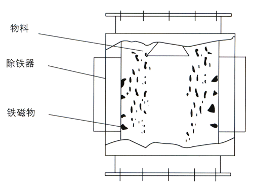 當顆粒狀物料經過永磁除鐵器的正下方時,混雜在物料中的鐵磁性雜質大約0.1—0.36公斤被吸起,由于除鐵器上的皮帶不停的運轉,當吸附在上面的鐵磁性物料經過無磁區時,便被皮帶上的鐵件刮出,扔進集鐵箱,從而達到連續自動除鐵的目的。